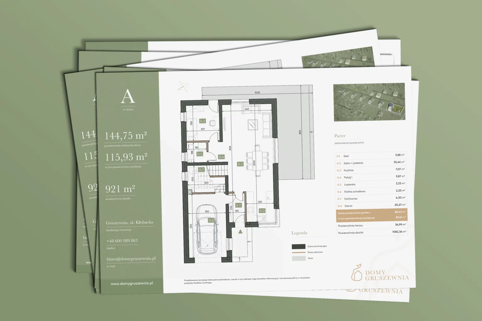 Etap 2: Branding i identyfikacja wizualna Stworzyliśmy kompletny branding inwestycji "Domy Gruszewnia", który nawiązuje do nazwy miejscowości i podkreśla związek z naturą. Wybrana paleta zielono-piaskowa oraz motyw gruszy idealnie komunikują spokojny, naturalny charakter lokalizacji.